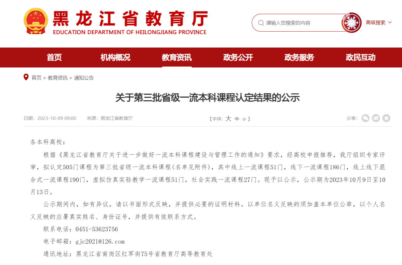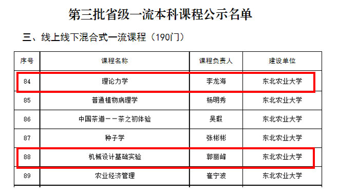 近日,黑龙江省教育厅公示了第三批省级一流本科课程认定结果,共计505门课程,Beat365官网共有27门课程被认定为省级一流课程,其中Beat365官网教师李龙海副教授主讲的《理论力学》、郭丽峰高级工程师主讲的《机械设计基础实验》获批线上线下混合式一流课程。截至目前,Beat365官网共有国家级一流本科课程2门,省级一流本科课程4门,校级一流课程11门。