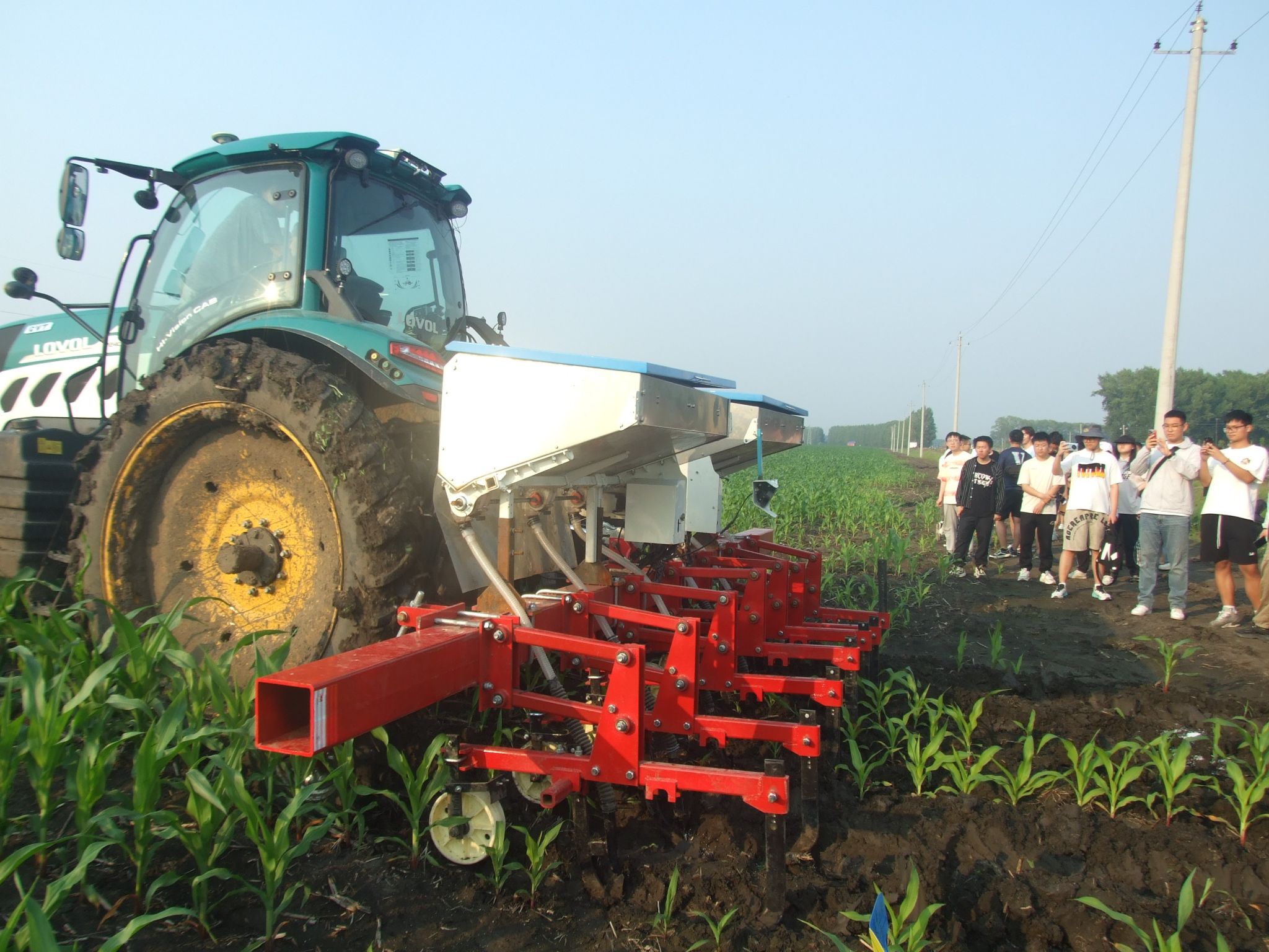 同学们还现场观摩了中耕追肥和喷药作业,进行了无人驾驶拖拉机的实操。学生们进入拖拉机驾驶舱内亲身感受和用手机操控无人驾驶拖拉机运行,真正的感受到了智能农机装备的科技感和先进性,打破了“我国农业机械科技落后”在学生们心中的传统认知,激发了学生用高精尖技术来武装我国农业机械的热情。