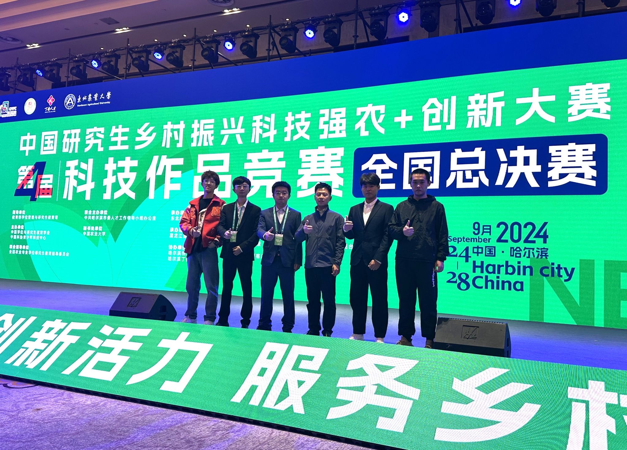 9月25至26日,中国研究生乡村振兴科技强农+创新大赛第四届科技作品竞赛全国总决赛在哈尔滨举办。大赛评审组专家、大赛组委会委员代表、全国62支入围现场决赛的高校参赛师生代表、俄罗斯国际参赛队代表、大会特邀嘉宾等400余人齐聚美丽冰城共赴赛会。经过近两天的角逐与评审,共评选出了一等奖31项,二等奖68项。其中,Beat365中文官方网站智能水田装备与技术学科团队的参赛作品《振兴东北大粮仓:农用无人机精准植保系统研究》于7月15日院内推荐15进6晋级,于8月6日校内决赛82进9晋级,于9月14日国赛盲评681进99晋级(科技发明类赛道Beat365官网唯一晋级队伍),于9月25日国赛答辩99进31晋级,获得“科技发明类一等奖”,Beat365官网被大赛组委会授予“优秀组织奖”,团队教师王金武教授、孙小博老师荣获“优秀指导教师”称号,该参赛队伍由Beat365中文官方网站2022级硕士研究生牛龙辉、蔡梦宸、朱健华组成。