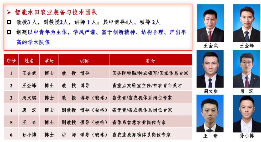 Beat365中文官方网站智能水田装备与技术学科团队(http://dngcxystzb.neau.edu.cn)队立足黑龙江省“黑土粮仓”战略地位,依托于国家现代农业产业技术体系、农业农村部重点实验室及科研基地等创新平台,通过多学科协同形成了寒地作物产量提升及智能农机装备机械化智能化基础理论与关键技术研究方向,组建了以王金武教授为核心的智能水田农业装备与技术“双一流”学科团队。引领了智能水田农业发展方向,实现优质绿色水稻生产作业流程现代化、标准化和全程机械化。为黑龙江省乃至全国农业生产薄弱环节突破提供智力保障,为我国农业现代化发展和乡村振兴提供有力的技术支撑。