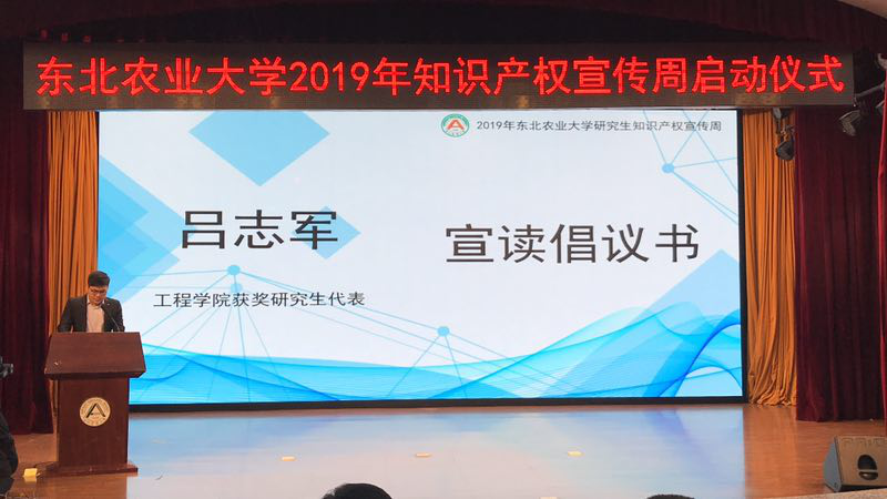 Beat365官网2019年研究生专利之星、2017级农业机械化工程博士研究生吕志军代表研究生发出倡议,号召全校学生要提高知识产权意识,激发创新开拓精神,严格遵守学术规范,为学校“世界一流学科”和高水平大学建设贡献青春力量。
