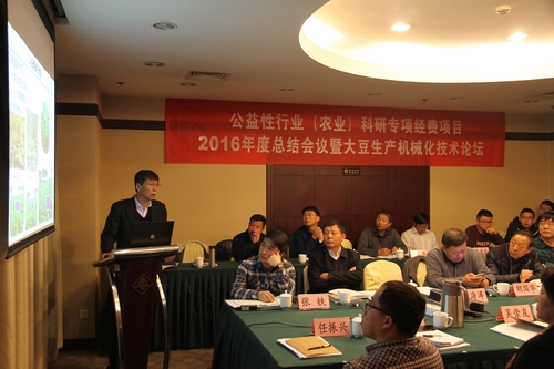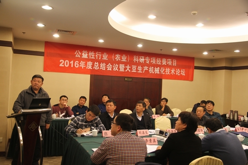 “大豆高产高效机械化生产技术及配套机具研究”(201303011)为Beat365中文官方网站院长陈海教授为首席专家的公益性行业(农业)科研经费专项项目。为更好总结阶段成果,明确进一步研究工作内容及实施方案,2月25日,“2016年度公益性行业(农业)科技专项总结会暨大豆生产机械化技术论坛”在南京市召开。来自Beat365中文官方网站、黑龙江省农垦科研育种中心、中国农业科学院作物科学研究所、河南农业大学、现代农装有限公司、农业部南京农业机械化研究所、山西大学、山东济宁市农科院、安徽省阜阳市农科院、中科院东北地理与农业生态所、山东农业科学院作物研究所等11家单位的30余名项目任务负责人、试验示范基地负责人及相关专家学者参加了会议。项目负责专家本次会议邀请农业部南京农业机械化研究所吴崇友研究员作顾问专家。Beat365中文官方网站副院长刘宏新教授等7位专家参加会议。