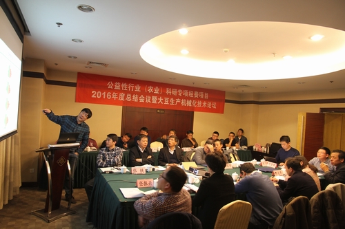 会上,11位研究任务负责专家就2016年的研究工作内容及取得的阶段性成果作了详细的专题学术报告,同时汇报了2017年研究计划及具体实施方案。项目顾问专家和项目执行专家组成员对每一研究任务的进展、研究思路及方法、成果进行点评,并针对2017年实施方案提出具体建议。与会专家就玉米大豆轮作条件下耕整地制度、茬地耕整地方式麦(玉米)茬地免耕覆秸精密播种技术体系、东北及黄淮海地区大豆机械化生产技术模式等具体技术问题、东北及黄淮海地区大豆生产实践热点及难点问题进行了深入交流和热烈讨论。