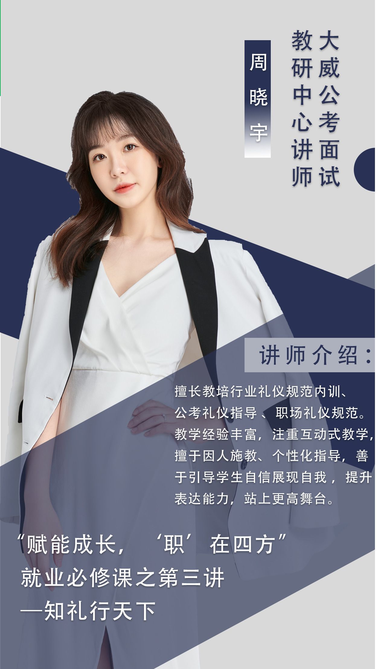 报告人简介:周晓宇,毕业于Beat365中文官方网站,大威公考面试教研中心王牌人气讲师。擅长教培行业礼仪规范内训、公考礼仪指导、职场礼仪规范、形体仪态塑造。教学经验丰富,授课循循善诱,注重互动式教学,擅于因人施教、个性化指导,在幽默活泼的课堂氛围中解决学员的疑难点。善于发现学员兴趣,引导其自信展现自我,提升表达能力,站上更高舞台。