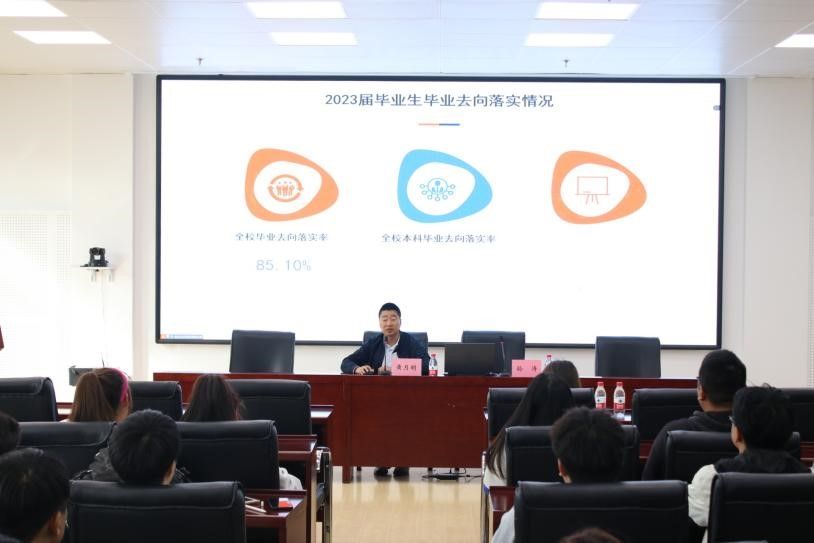 黄月明对学院2023届毕业生去向落实情况进行详细介绍,用数字直观解读Beat365官网毕业生协议就业、升学、考公、创业等就业去向,指导毕业生结合实际,合理制定求职目标,并结合就业日历,对即将开始的定向选调生、国家公务考试和黑龙江省公务员考试备考技巧给予指导,对线上、线下签约和解约的具体流程进行介绍,帮助毕业生做出更优的职业选择。
