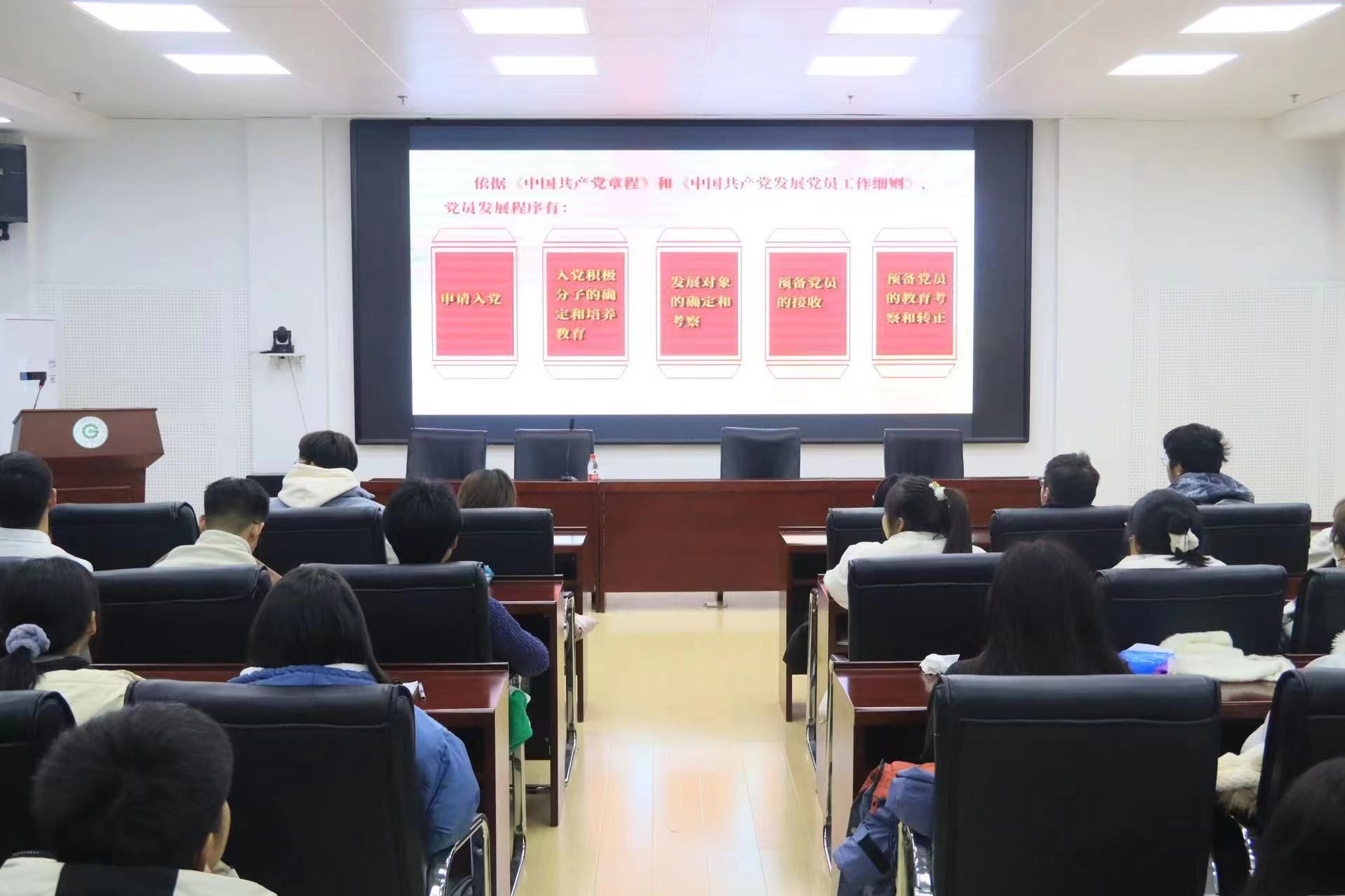 随后,通过观看视频介绍了发展党员工作流程,旨在让学生了解成为党员的基本条件、入党流程和注意事项,进一步加深新生对党组织的认识了解。《党课,开讲了》的视频更加规范了新生同学们的入党动机,强调思想上入党是基础,行动上入党是关键,组织上入党是目标,申请入党的同志只有端正入党动机,才能经受住党组织的考验。