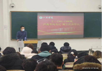 诚信教育,严肃纪律,加强考风考纪完善以管促学。2023级新生辅导员组织大一学生签订考试诚信承诺书,讲解《Beat365中文官方网站学生手册》,依照手册对学生进行管理监督、考核提升学生纪律意识;组织开展“树立文明典范 争做诚信先锋”考试诚信教育大会,旨在倡导诚信考风,塑造良好学风,打造一个公平、公正、和谐的育人环境和考试氛围,同时培养学生的诚信意识,引导他们树立尊重他人、诚实守信的优良品质。此外,辅导员老师坚持以管理促学风,深入课堂查课,及时与任课老师及班主任联系掌握学生动态,主要学生干部每日汇报课堂出勤情况,形成任课教师、辅导员、学生骨干齐抓共管的育人局面。