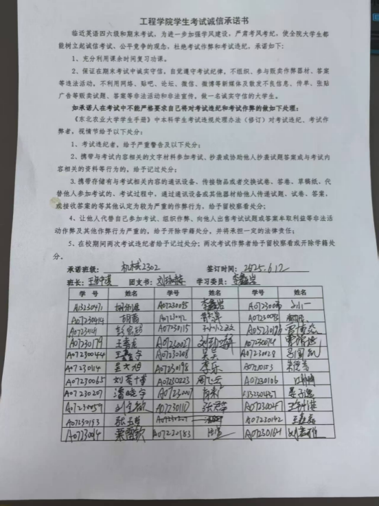 学院辅导员考前发布温馨提示,组织全体本科生和研究生签署了《考试诚信承诺书》。承诺书明确要求遵守考场纪律、独立完成答卷、抵制任何舞弊行为。通过庄重的签署仪式,进一步强化了学生的规则意识和责任担当,引导学生以实际行动践行诚信价值观。